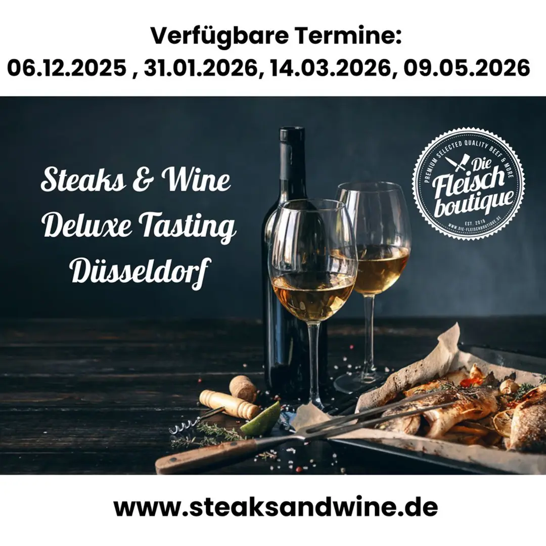 Bei diesem „Deluxe Tasting“ entführen wir Euch auf eine kulinarische Reise durch unser „Prime-Beef“ Portfolio aus aller Welt! Nach dem „Gruß aus der Küche“ erwarten Euch 5 verschiedene Zuschnitte vom Rind aus unserem Premiumsegment und/ oder auch vom 100%-igen Ibericoschwein . Dazu werden wir Euch passende und erlesene Weine vorstellen und das Programm mit hausgemachten Salaten und Brotaufstrichen abrunden. Ein süßer Abschluss beendet diese Reise! Lasst Euch diesen Feinschmecker-Abend nicht entgehen, genießt diese kulinarischen Stunden im gemütlichen Ambiente der Fleischboutique, schaut uns beim Grillen über die Schulter und lasst Euch tolle Zubereitungstipps mit auf den Weg geben!